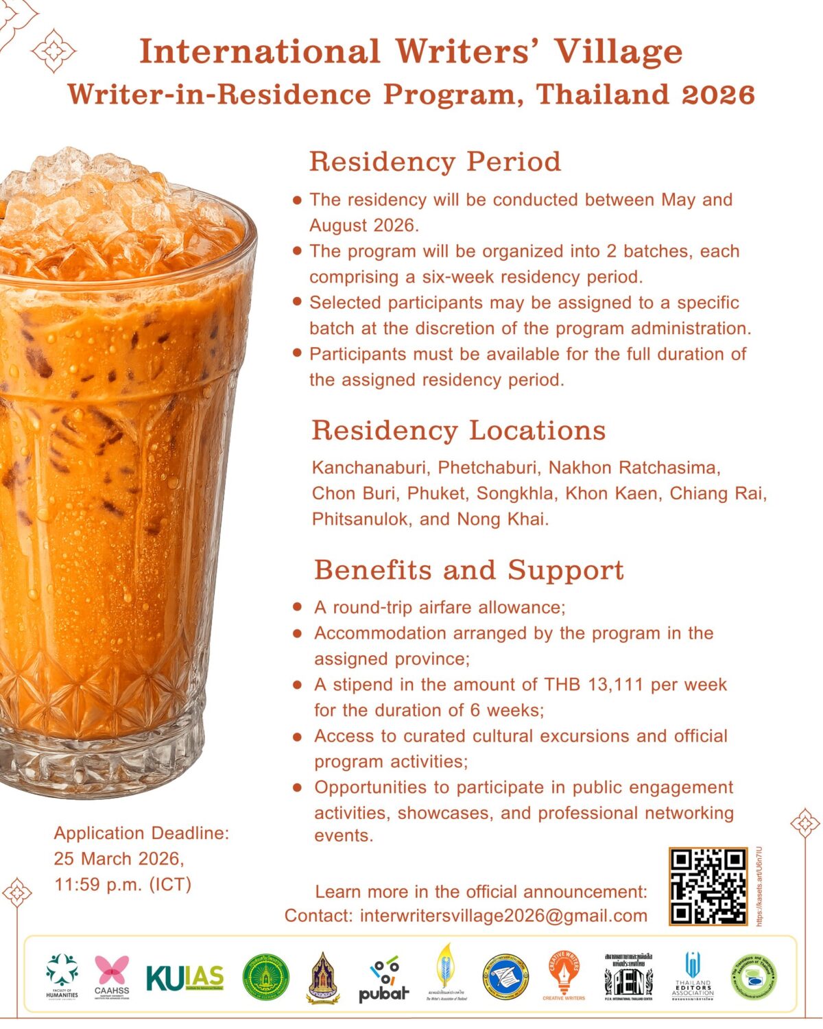 A writer-in-residence program in Thailand for international writers, under the collaboration of the Department of Cultural Promotion, Ministry of Culture, and the Faculty of Humanities, Kasetsart University, is currently accepting applications. Please find additional information here: https://kasets.art/U6n7IU