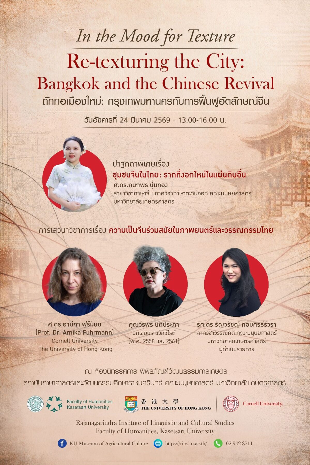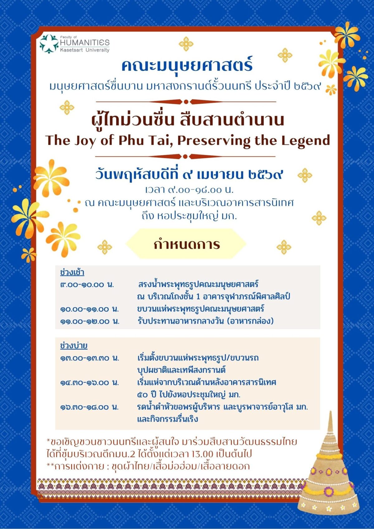 คณะมนุษยศาสตร์ มหาวิทยาลัยเกษตรศาสตร์ ขอเชิญชาวนนทรีและผู้สนใจร่วมงาน มนุษยศาสตร์ชื่นบ้าน มหาสงกรานต์รั้วนนทรี ประจำปี 2569 ในธีม ผู้ไทม่วนซื่น สืบสานตำนาน เพื่อร่วมอนุรักษ์วัฒนธรรมไทยผ่านกิจกรรมสรงน้ำพระ ขบวนแห่รถบุปผชาติ และพิธีรดน้ำดำหัวขอพรผู้อาวุโส วันพฤหัสบดีที่ 9 เมษายน 2569ตั้งแต่เวลา 9.00 – 18.00 น.สถานที่: คณะมนุษยศาสตร์ อาคารสารนิเทศ และหอประชุมใหญ่ มก.การแต่งกาย: ชุดผ้าไทย เสื่อม่อฮ่อม หรือเสื้อลายดอก ——————————————— Faculty of Humanities, Kasetsart University, cordially invites the Nontri community and the public to join our Songkran Festival 2026: The Joy of Phu Tai, Preserving the Legend. Celebrate this Thai New …