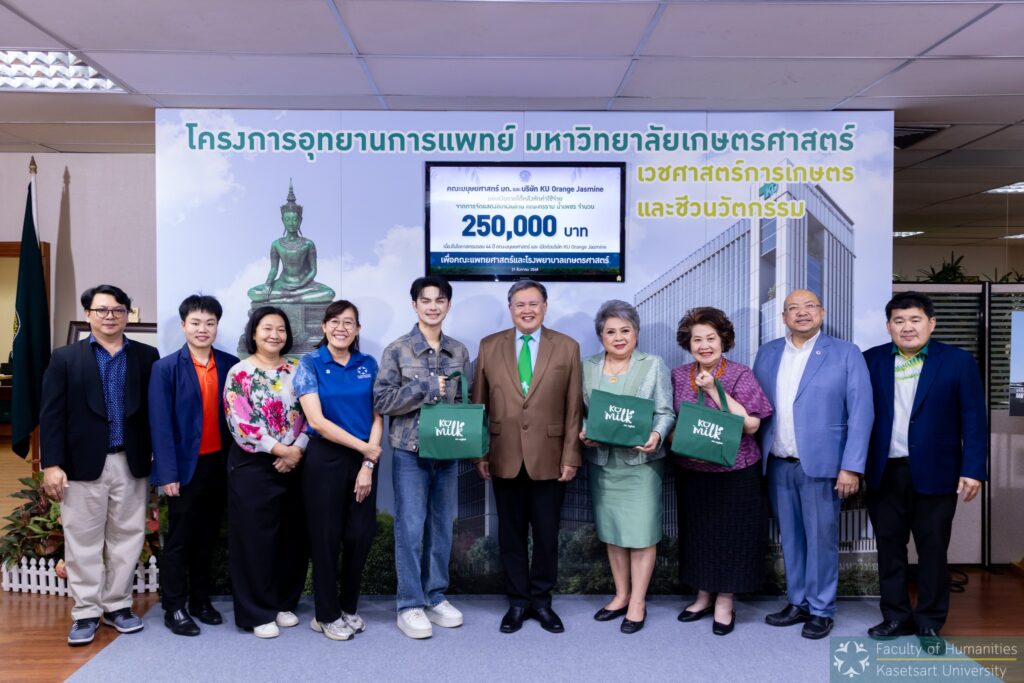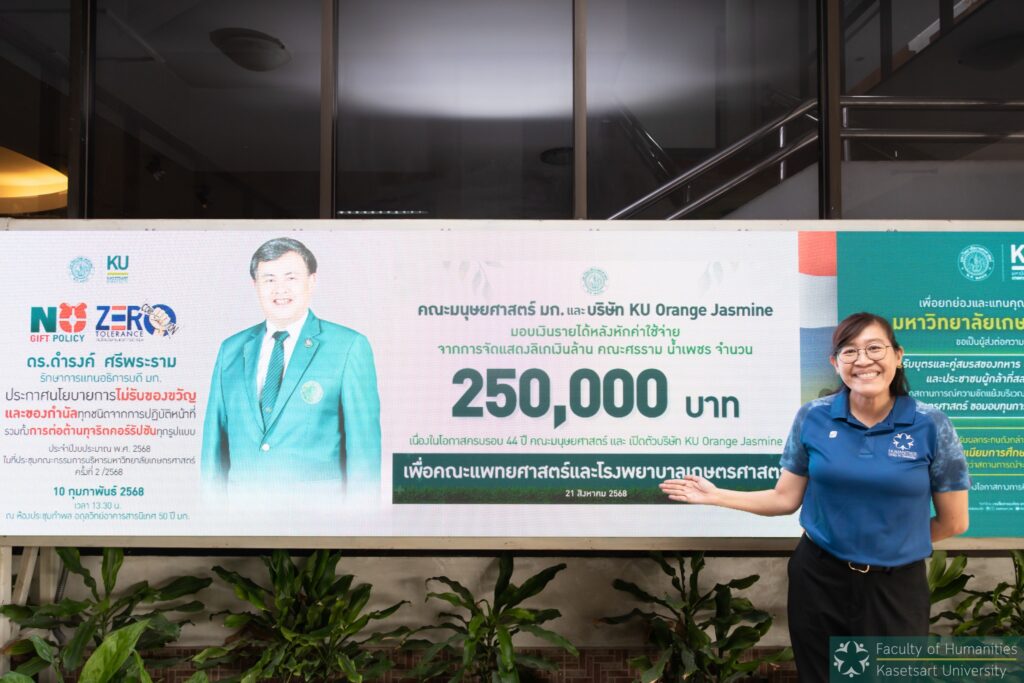 ผศ.ดร.ธงรบ รื่นบรรเทิง คณบดีคณะมนุษยศาสตร์ พร้อมด้วย รองคณบดี และคณาจารย์คณะมนุษยศาสตร์ เข้ามอบเงินสมทบทุนสร้างโรงพยาบาลมหาวิทยาลัยเกษตรศาสตร์ จำนวน 250,000 บาท ซึ่งเป็นรายได้หลังจากหักค่าใช้จ่ายในการแสดงลิเกเงินล้านคณะศรราม น้ำเพชร เนื่องในโอกาสสถาปนาคณะมนุษยศาสตร์ ครบรอบ 44 ปี และเปิดตัวบริษัท KU Orange Jasmine โดยมี ดร.ดำรงค์ ศรีพระราม รักษาการแทนอธิการบดีมหาวิทยาลัยเกษตรศาสตร์เป็นผู้รับมอบ